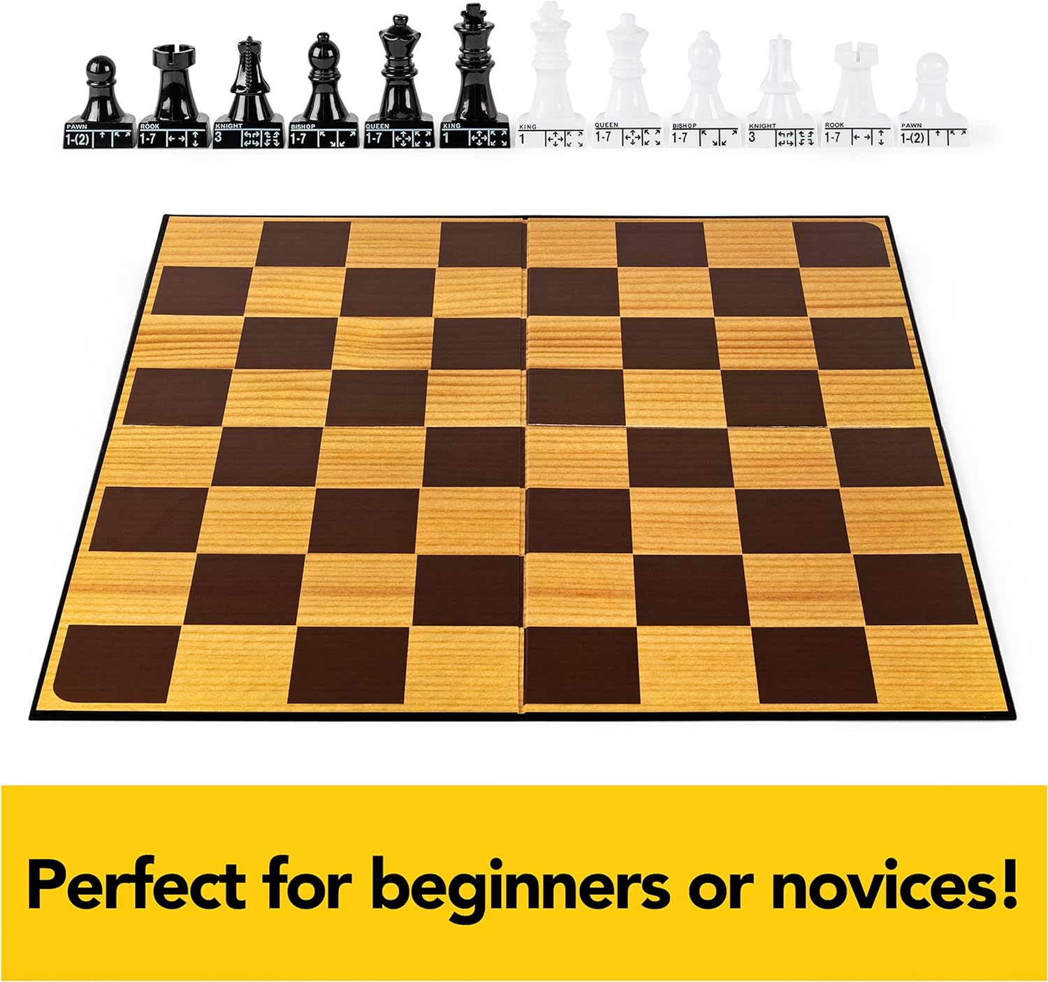Cardinal Classics Chess Teacher is a chess set for learners, with labeled movers made specifically for beginners. All you need is 2 players- a perfect couples game- or grab a friend or family member. This chess set for adults or kids ages 8 & up is easy to set up. Clearly marked pieces make learning chess easy! Large chess pieces show the direction and number of spaces each piece can move. Our Chess Teacher chess set can help teach beginners or novices the different chess moves. Its unique notation system will enhance enjoyment, too. Examine the chess pieces for a moment and study the unique notation. Each piece shows its name and tell how many spaces and in what direction it moves. No need for a chess clock or other fancy accessories, this kids’ board game is all about learning. If you are searching for a fun gift for a smart person in your life, look no further than this chess set board game for kids ages 8-12. It is also a great adult board game- anyone who is curious to learn the time-tested classic game of chess will adore this set. From Cardinal Classics, Chess Teacher is the best way to go from beginner to grandmaster.