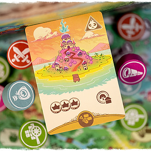 The same action tokens are then used to activate worker locations on the mainland. Worker locations reduce in power every time an action token is placed there.