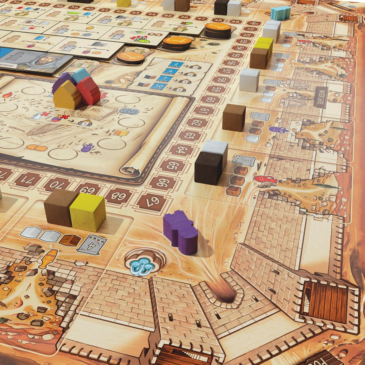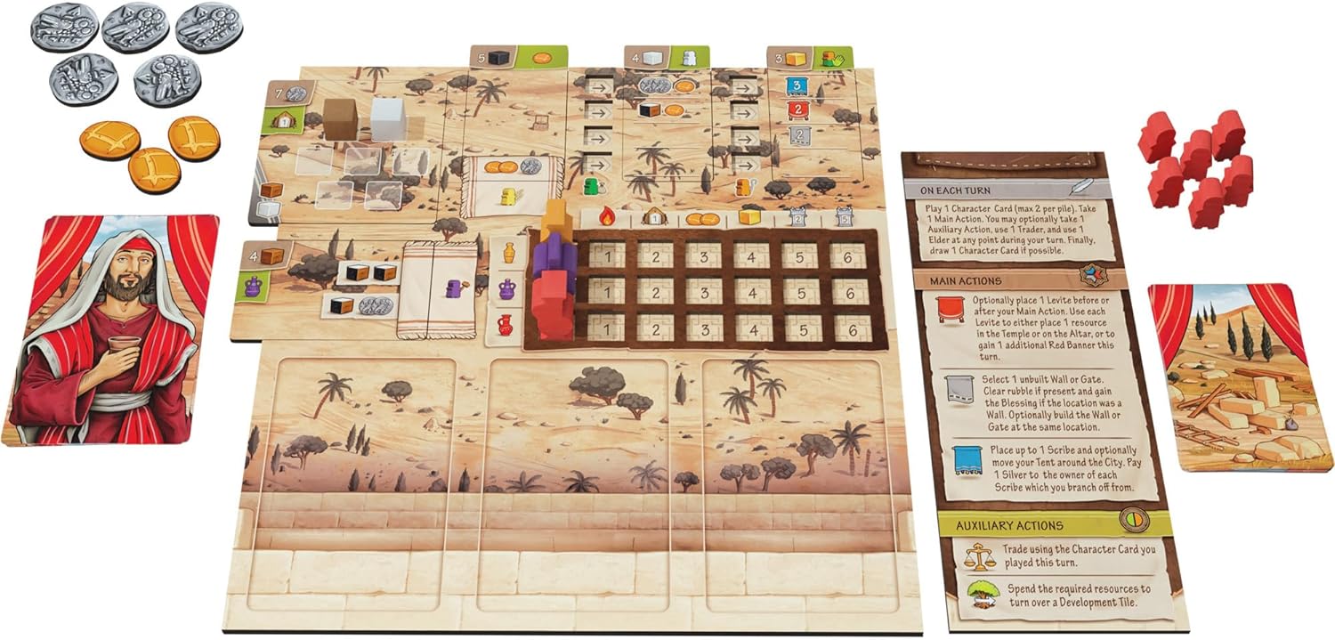 Ezra and Nehemiah is a thematic strategy game for 1-4 players, set in ancient Jerusalem. Players will be building the temple and city walls, and teaching the Torah to returning exiles. Players may also seek to develop their land, travel to settlements outside the city walls, or stoke the altar's fire to keep it burning day and night. The prophets, Haggai and Zechariah will be doing their part to keep the people focused on what is most important.