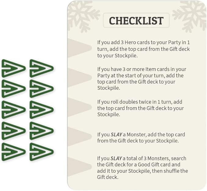 This festive Here to Slay expansion pack will make your Christmas wishes come true! It includes 2 new card types, 4 Holiday Overlay cards that give your Party Leaders new effects, and a brand new win condition to add to the holiday fun.