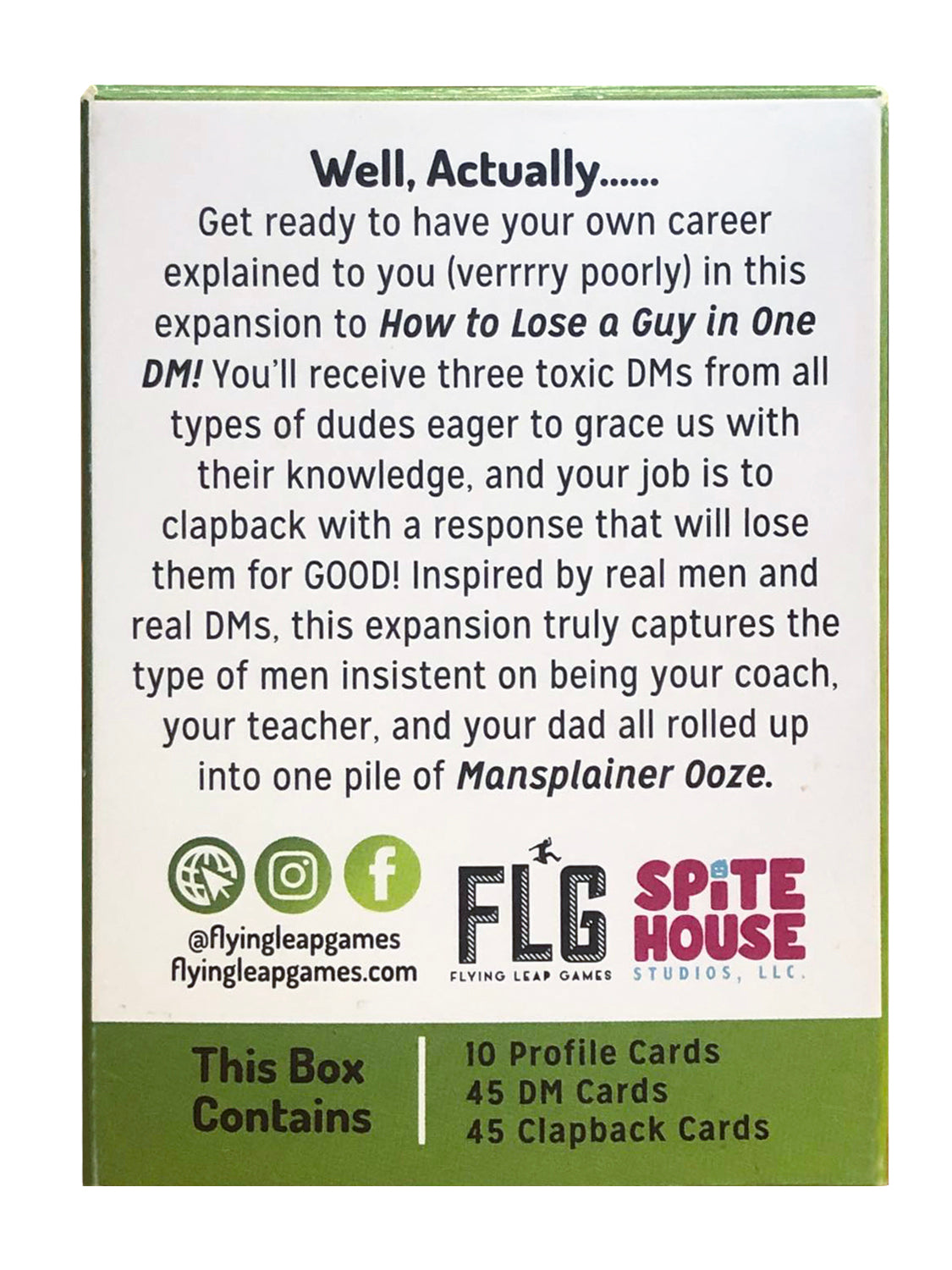 Inspired by real men and real DMs, this expansion truly captures the type of men insistent on being your coach, your teacher, and your dad all rolled up into one pile of mansplainer ooze. Enjoy this expansion by playing it on the play mat supplied in the original game, How to Lose a Guy in One DM!