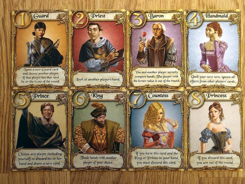 All of the eligible young men (and many of the not-so-young) seek to woo the princess of Tempest. Unfortunately, she has locked herself in the Palace, and you must rely on others to bring your romantic letters to her. Will yours reach her first? love letter is a game of risk, deduction, and luck for 2 to 4 players. Your goal is to get your love letter into princess Annette's hands while deflecting the letters from competing suitors. From a deck with only sixteen cards, each player starts with only one card in hand; one card is removed from play. On a turn, you draw one card, and play one card, trying to expose others and knock them from the game. Powerful cards lead to early gains, but make you a target. Rely on weaker cards for too long, however, and your letter may be tossed in the fire.