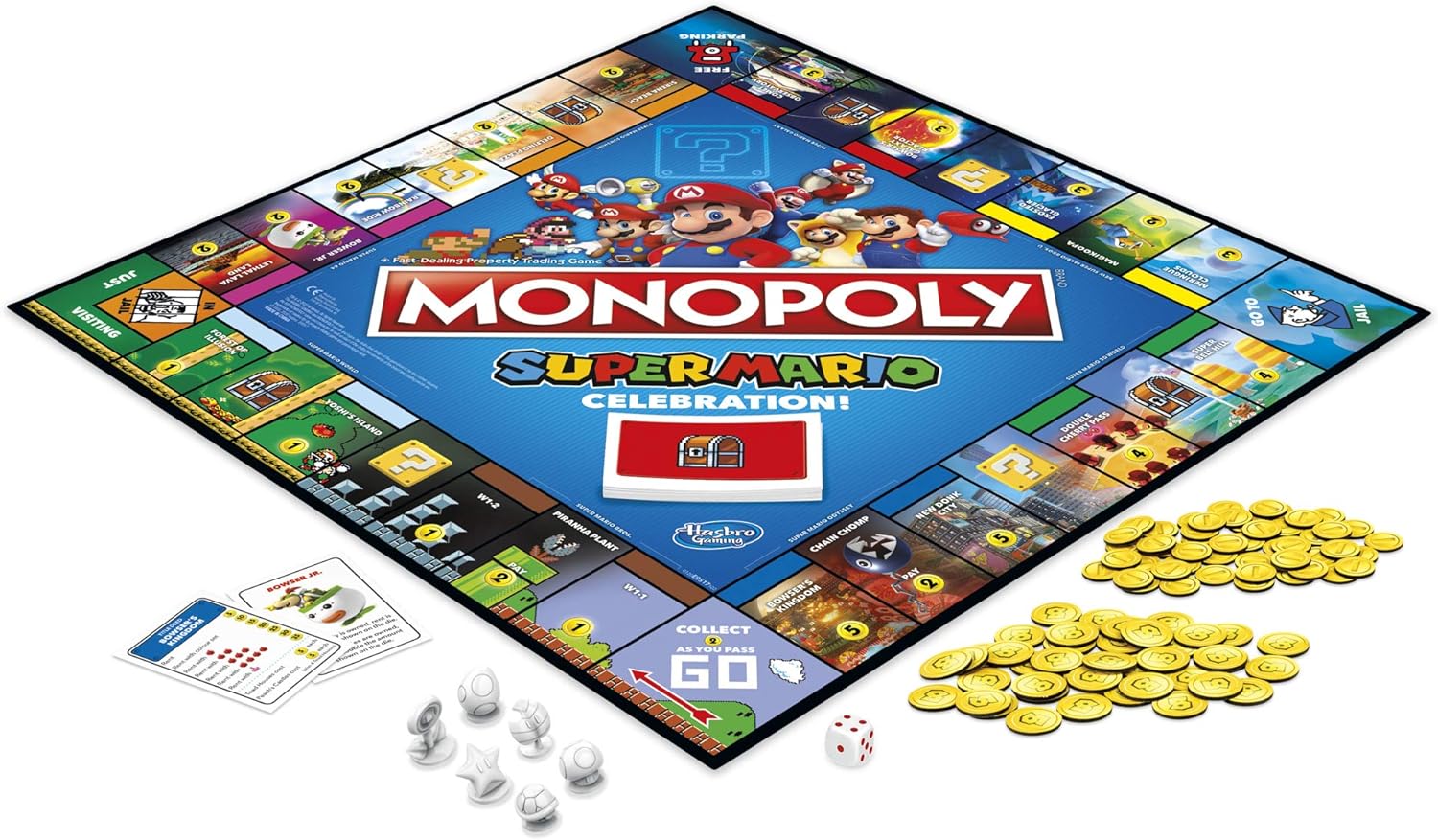 The Super Mario Celebration edition of the Monopoly game offers action-packed excitement along with nostalgia. Choose from 6 tokens designed with the Super Mario enthusiast in mind, and buy, sell, and trade locations from iconic Super Mario games. It features beloved characters and themes through the years, all the way back to 1985 and the first Super Mario Bros. video game. The Monopoly game features a Question Block with sound effects that can change a player's luck. Toad houses and Princess Peach's castles replace houses and hotels. The board game is a great gift for gamers and a birthday or holiday gift for Super Mario fans, ages 8 and up.