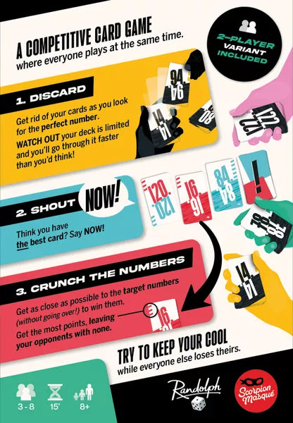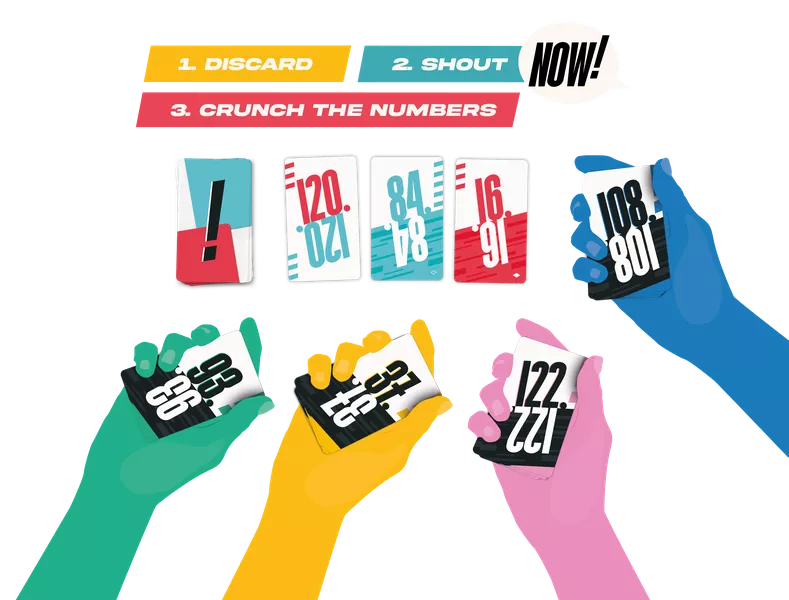 NOW! is a real-time competitive card game where everyone plays at the same time. Discard your cards as quickly as possible in search of the perfect number! Watch out, your deck is limited and you’ll go through it faster than you’d think! Think you have the best card? Shout «NOW!» Get as close as possible to the target numbers (without going over!) to win them. Get the most points, leaving your opponents with none. And, most importantly, try to keep your cool, while everyone else loses theirs!