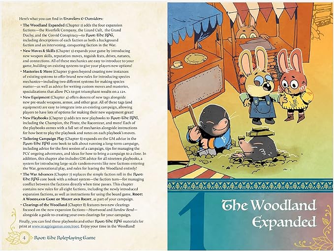 Travelers & Outsiders is a supplement for Root: The Roleplaying Game, the officially licensed tabletop RPG based on the award-winning Root: A Game of Woodland Might and Right board game by Leder Games - that expands the core game to include the first 4 expansion factions!