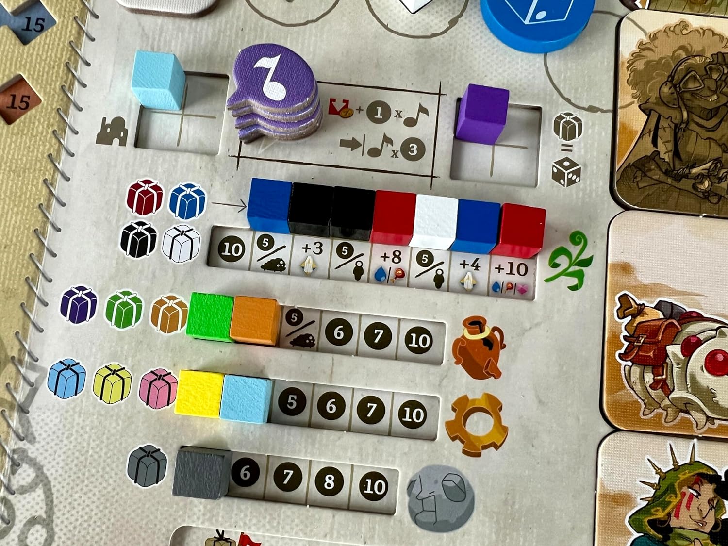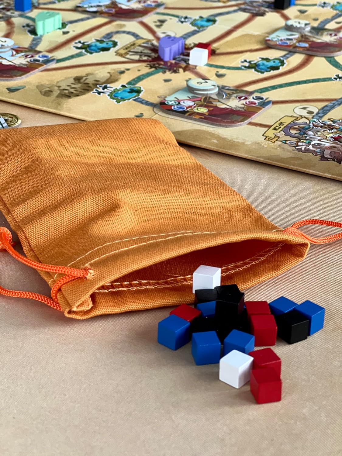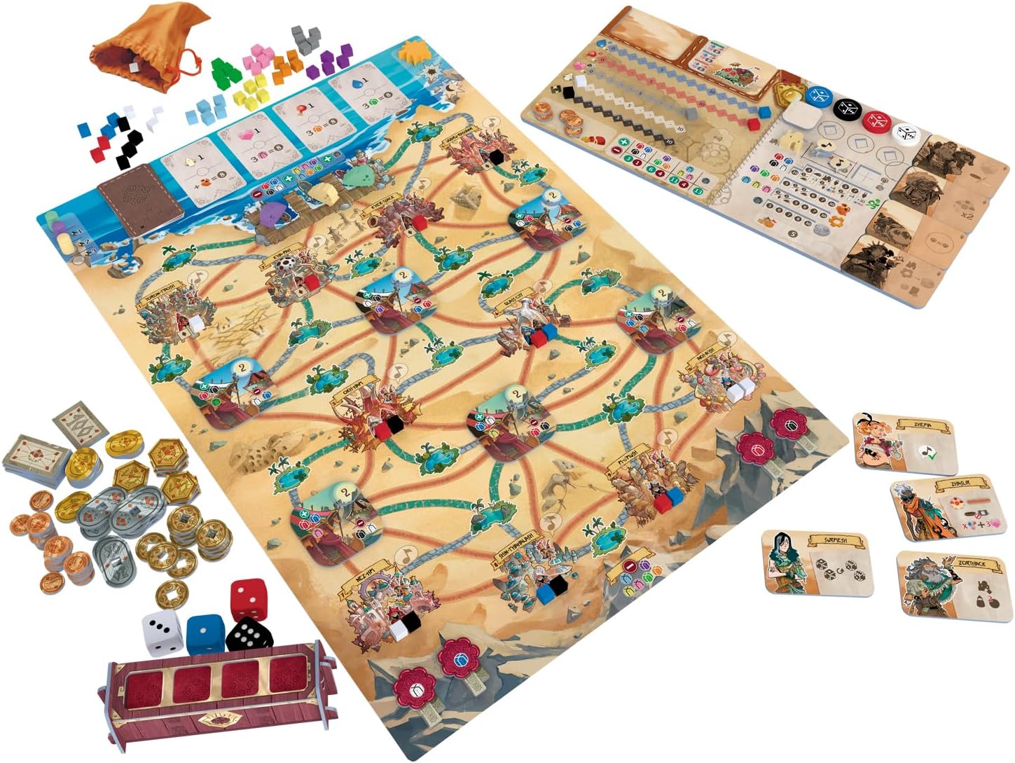 Designed by Ariel Di Costanzo and Javier Pelizzari and illustrated by Ernest Sala, Sand is a game with a main mechanism of pick-up-and-deliver that can be enjoyed alone or in groups of up to four players in games of about 120 minutes long. Players have to earn as much gold as possible after six rounds (five in a four-player game) to win.