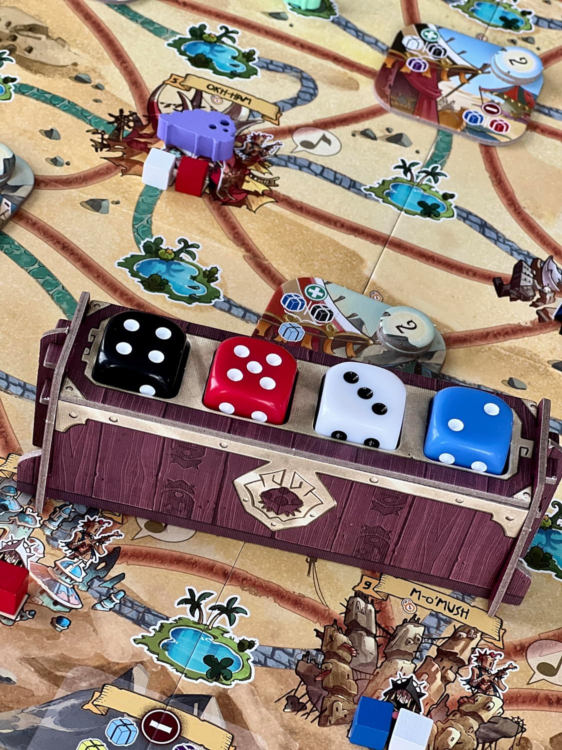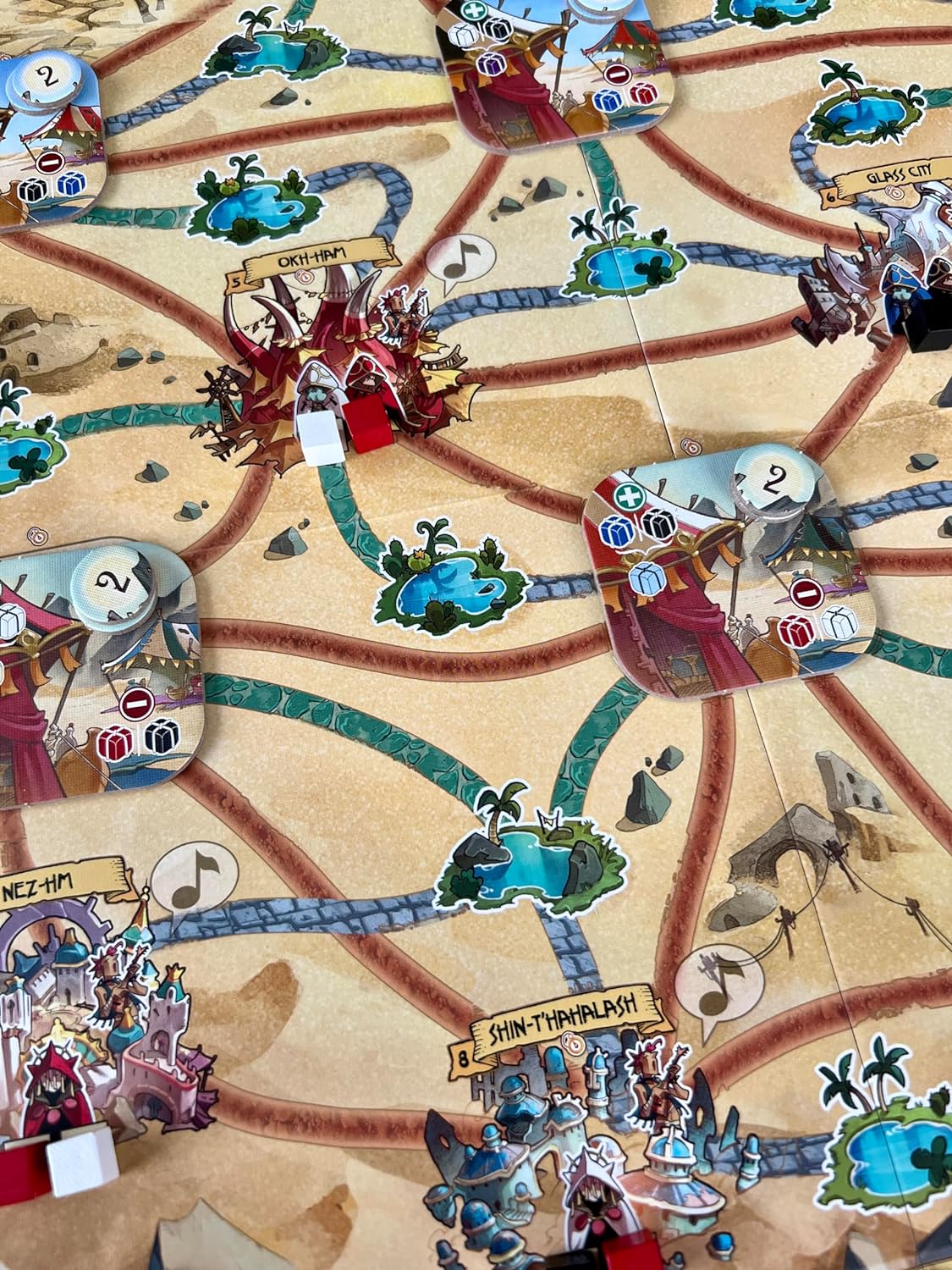 In Sand, players put themselves in the shoes of these intrepid desert travelers who travel the paths of the board and visit the different towns. They collect goods to take them to other places and thus earn gold for the transport service. They cross the dunes on the backs of their faithful caterpillars, which, cared for, will grow and help players complete their tasks more effectively. Along the way they will be joined by helpful companions and be entrusted with missions that, if completed, will bring good benefits at the end of the journey. Help the plants take root again, and perhaps there is still some hope for this desolate place...