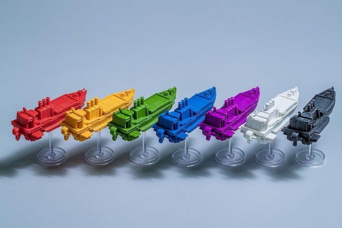 In the airship module, 2 airship tiles are randomly paired at the beginning of the game (1 passive and 2 aggressive; there are 16 total tiles). Each player’s airship miniature (a new type of unit; 1 big miniature for each of the 7 factions [the sculpts are identical, and the bases are different colors to match the factions]) has those abilities, as well as the core ability that airships are free to move onto any territory (land or water) and across rivers. Each player starts with their airship on their home base, so they can start moving out of their home area right away. The airship miniatures measure 104x34x42mm, and they have clear, plastic, removable stands/bases.