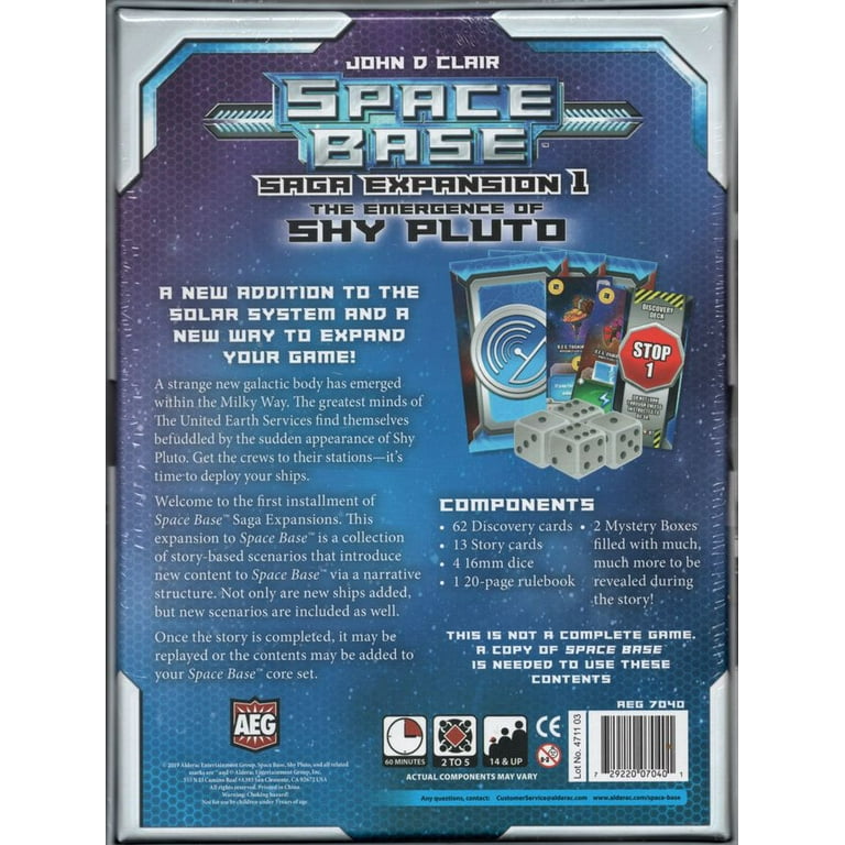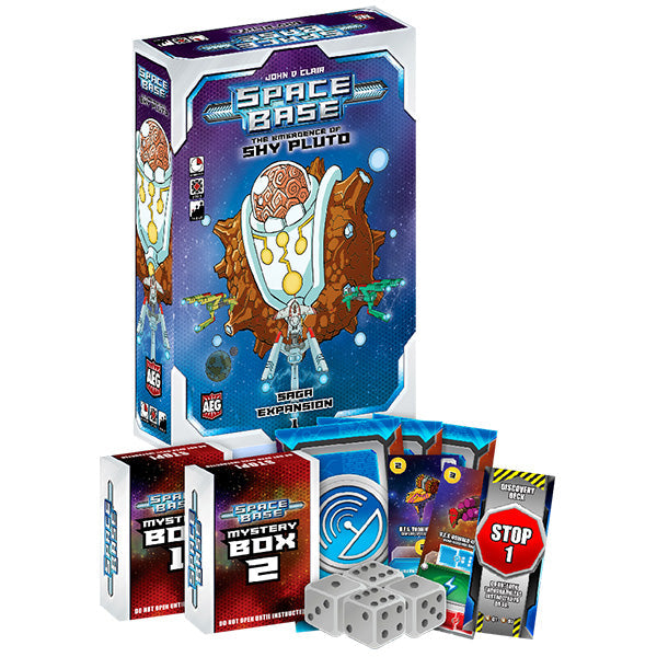 A strange new galactic body has emerged within the Milky Way. The greatest minds of The United Earth Services find themselves bewildered by the sudden appearance of Shy Pluto. Get the crews to their stations — it's time to deploy your ships. The Emergence of Shy Pluto is the first installment of Space Base "Saga Expansions". This expansion to Space Base is a collection of story-based scenarios that introduce new content to the game via a narrative structure. Not only are new ships added, but new scenarios are included as well. Once the story is completed, it may be replayed or the contents may be added to the Space Base base set.