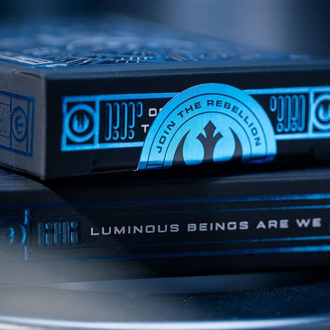 The outer packaging for both decks is breathtaking, with striking, vibrant blue and red foil - the perfect way to balance the Force! Mixed with clear, reflective foil that creates the illusion of the Millennium Falcon or Imperial Throne Room windows.