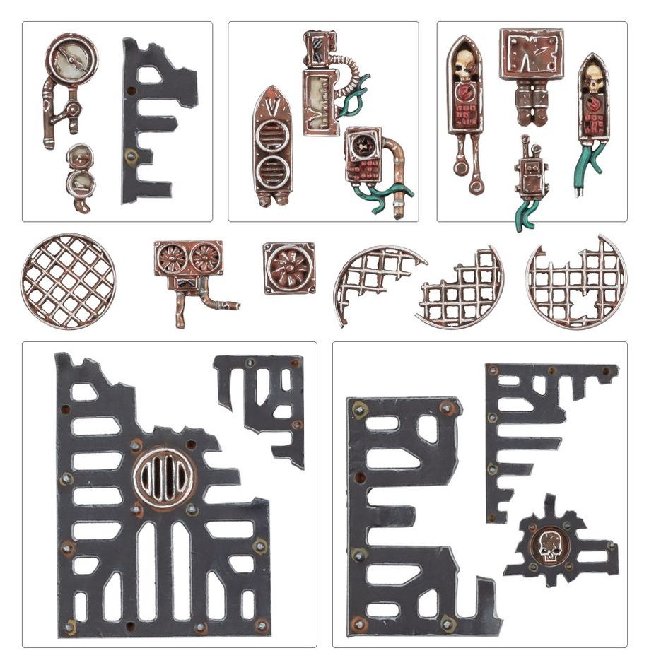 In addition to the bases, this kit contains loads pieces of grim and industrial basing material to add detail and narrative elements to your miniatures, such as gantry sections, broken grille panels, discarded fans, shattered gauges, and time-worn vox relays.