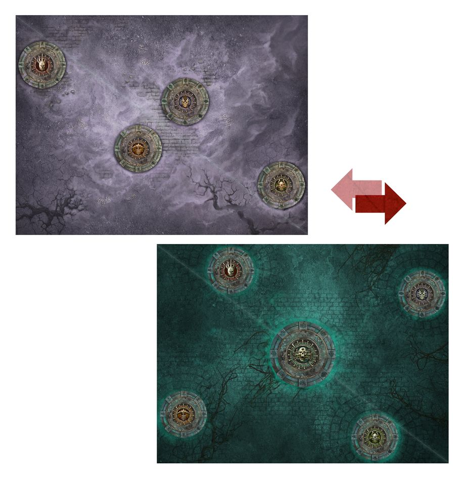 – 1x Double-sided game board: This game board features four printed objectives on one side, and five on the other, and is designed for use in your Spearhead games. It depicts the barren Shyishan landscapes of Ossia – Sand, on one side, and Dolorum – Bone, on the other.