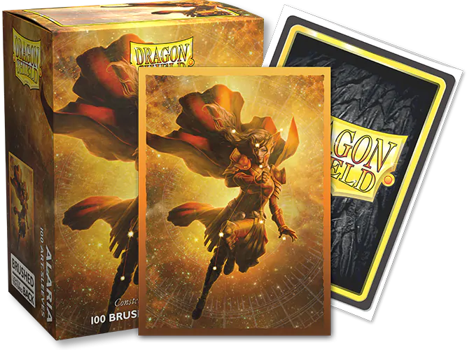 The zodiac Alaria burns in the night sky when outmatched mortals cry out for her help. She is the embodiment of the caring and just virtues, and rallies to turn the tides for those who call upon her. The second installment in the Constellation series once again features captivating artwork by MTG artist Jason Engle. Experience the silky-smooth shuffle feel of Dragon Shield Brushed Art sleeves. Brushed sleeves feature a lightly textured back making cards glide effortlessly when shuffling. The artwork has gradient frames and high detail printing which won't peel or split. Standard size card sleeves for cards sized measuring up to 63x88 mm (2½"x3½"). Great for TCGs like MTG, Pokémon, Lorcana & Flesh and Blood! The sturdy cardboard box fits 75+ single sleeved cards or 65+ double sleeved cards.