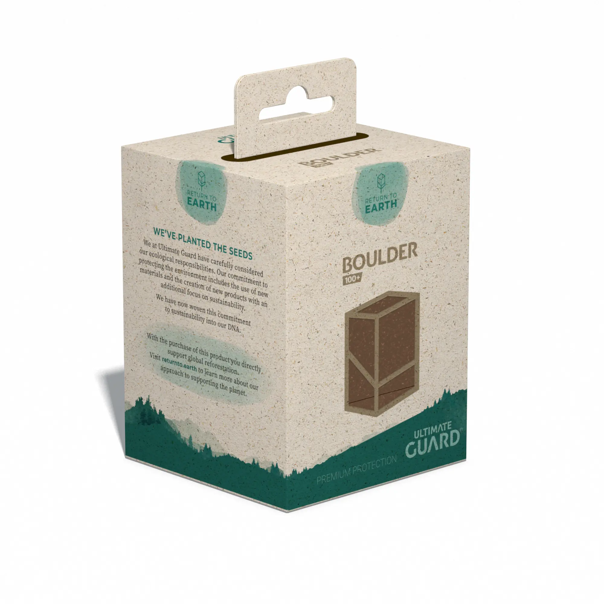 We at Ultimate Guard have carefully considered our ecological responsibilities. Our commitment to protecting the environment includes the use of new materials and the creation of new products with an additional focus on sustainability. Developed and produced in Germany, this handy and solid Boulder 133+ with super-easy opening consists of 87% renewable resources, with a FSC certified grass paper packaging. The deck case is recyclable and holds up to 133 double-sleeved or 160 single-sleeved cards when using Ultimate Guard Sleeves. With the purchase of this Return to Earth product you directly support global reforestation.