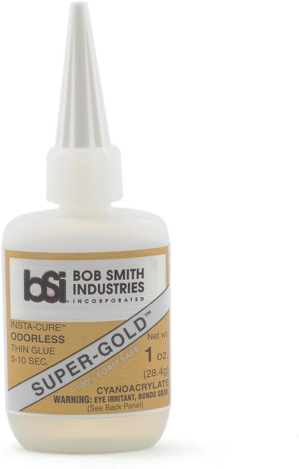 SUPER-GOLD and SUPER-GOLD+ are our odorless INSTA-CURE CAs They are non-frosting and take only 2 or 3 seconds longer to bond. There are no fumes that irritate the nose and eyes. The SUPER-GOLDs do not attack white foam; therefore, they can be used in the building of foam core wings and the assembly and repair of plastic and foam ARFs. They will not fog clear plastic. SUPER-GOLD+ is ideal for attaching clear canopies in plastic model kits; however, MAXI-CURE is still recommended for assembling the rest of plastic kits. Wood can be bonded to white foam with SUPER-GOLD + in less than fifteen seconds. For bonding foam to foam, spray a very light fog of INSTA-SET to one piece and apply SUPER-GOLD+ to the other before joining. Excess INSTA-SET may create too much heat, which can melt the foam. Both SUPER-GOLDs cure to a more flexible consistency for better shock absorbtion. Whenever a large amount of CA is to be used in such applications as saturating fiberglass or Kevlar, SUPER-GOLD eliminates the irritating fumes from the evaporating monomer that make repeated use of CA unpleasant at times.