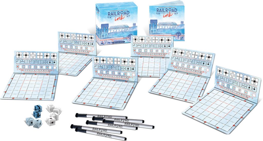 In the multiplayer puzzle game Railroad Ink, your goal is to connect as many exits on your board as possible. Each round, a set of dice are rolled in the middle of the table, determining which kind of road and railway routes are available to all players. You have to draw these routes on your erasable boards to create transport lines and connect your exits, trying to optimize the available symbols better than your opponents.