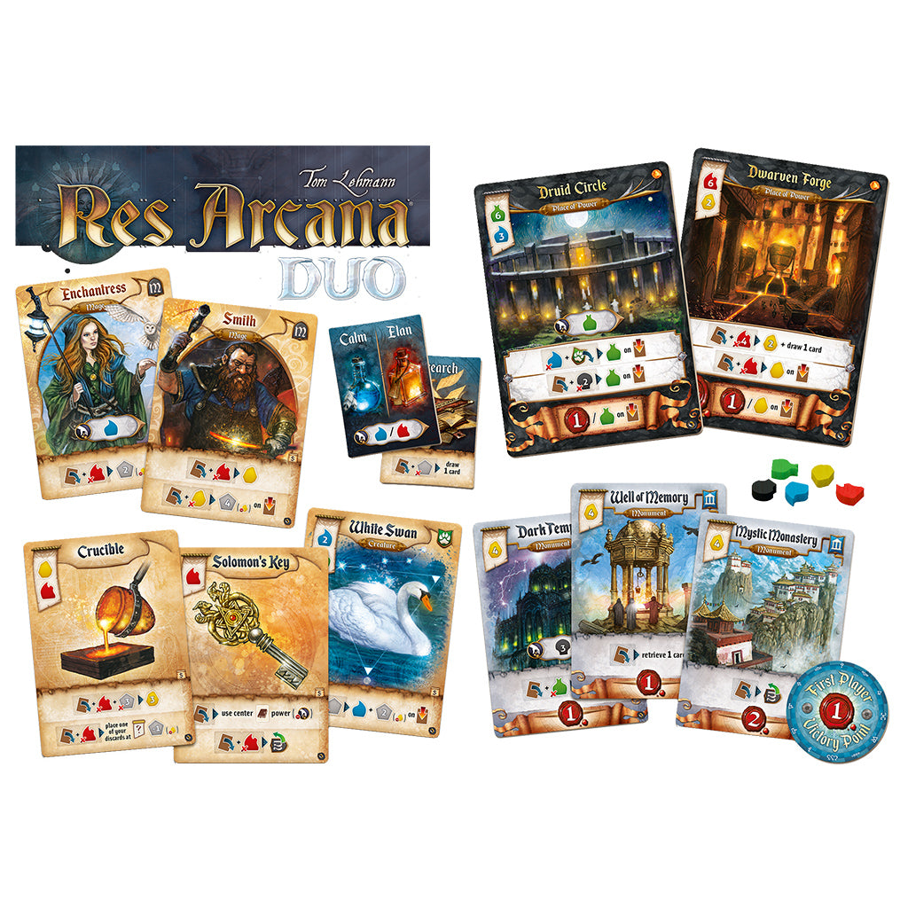 Res Arcana Duo is a stand alone installment in the acclaimed series of Res Arcana games. Specifically designed for two players and offering a dynamic and quick gameplay, Duo offers a whole new set of Mages, Artifacts, Monuments and Places of Power. You can also use Res Arcana Duo as an expansion to Res Arcana or expand Duo with Lux et Tenebrae et Perlae Imperii for even more possibilities and strategies.