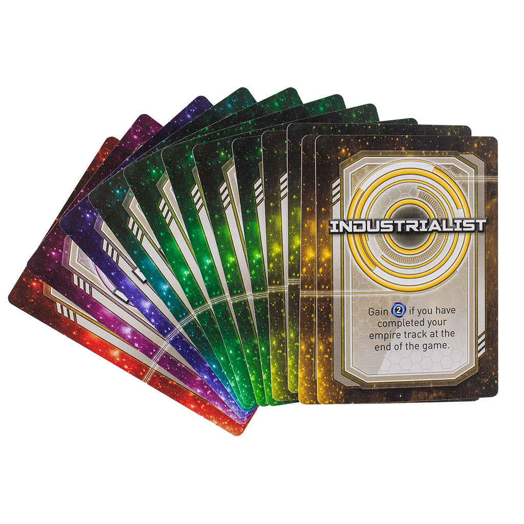 5 Galaxy Mats, 1 Control Mat, 40 Planet Cards, 12 Mission Cards, 7 Custom Dice, 20 Wooden Ships, 15 Wooden Tokens, 1 Rulebook.