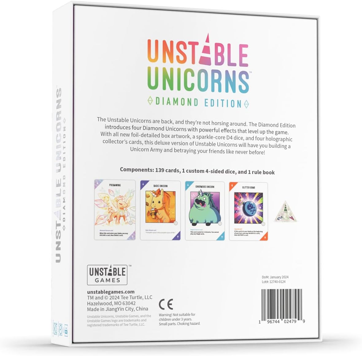 The Unstable Unicorns are back, and they're not horsing around. The Diamond Edition introduces four Ultimate Unicorns with powerful effects that level up the game. With all new foil-detailed box art, a sparkle core D4 die, and four holographic collector's cards, this deluxe version of Unstable Unicorns will have you building a Unicorn Army and betraying your friends like never before!